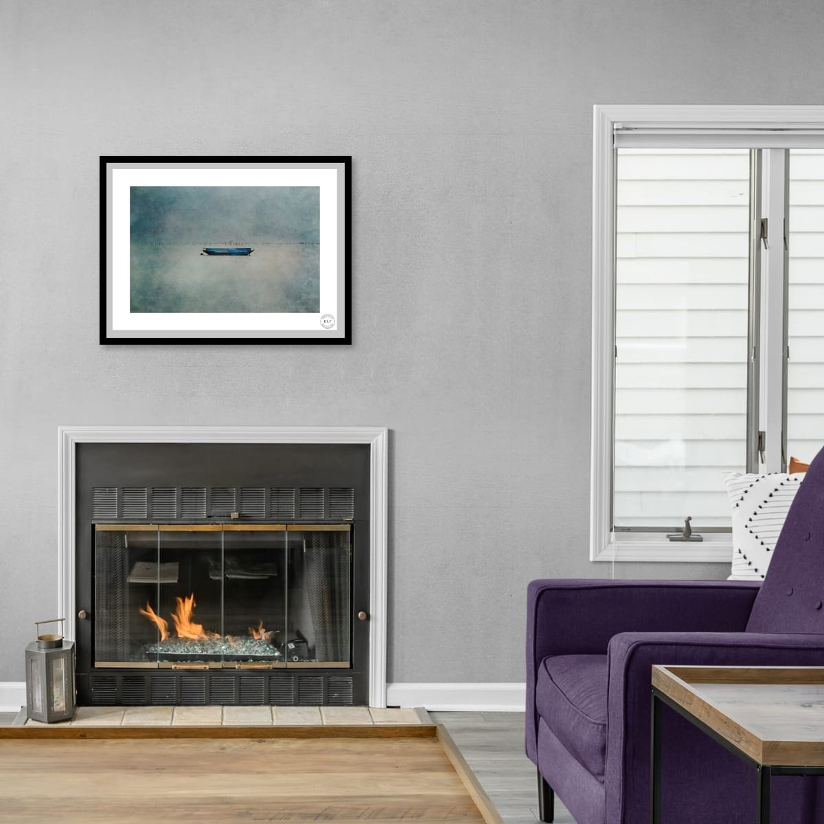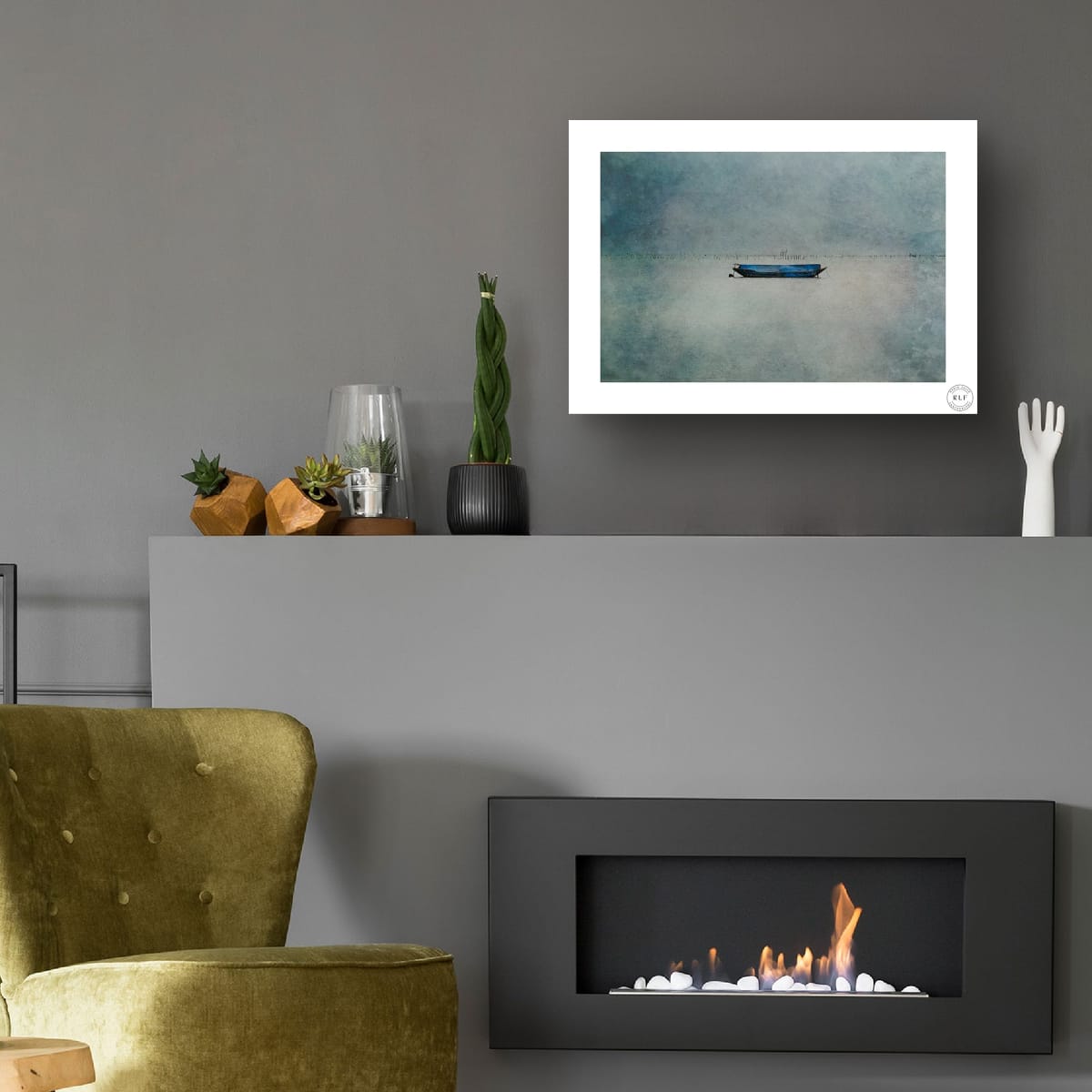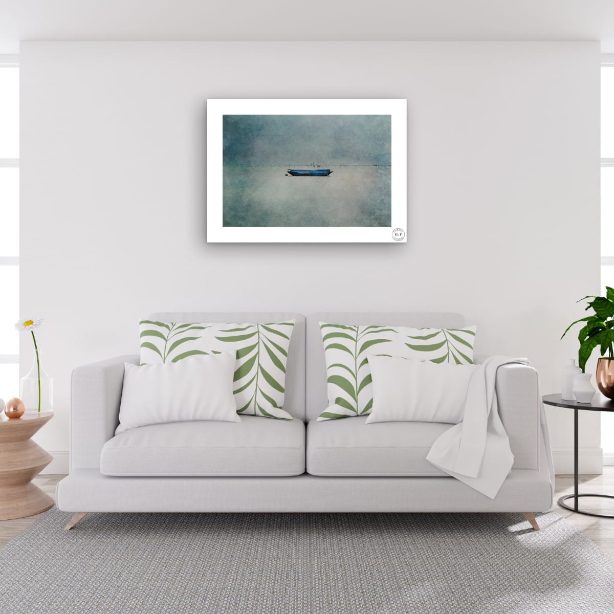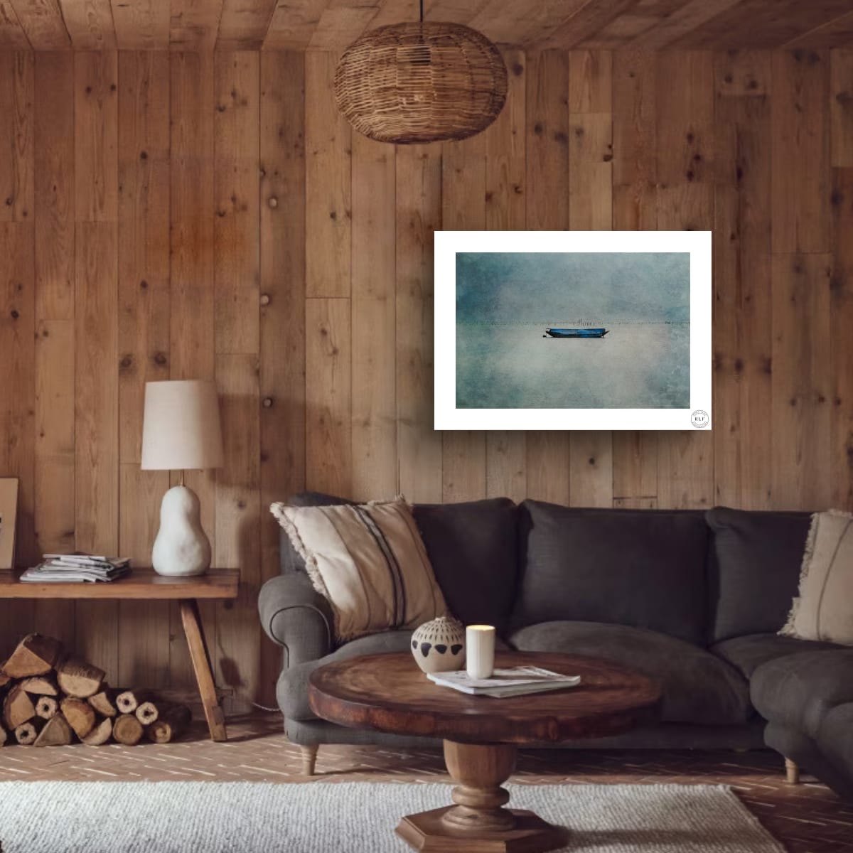 I captured this tranquil scene of a fishing boat gently moored in a serene lagoon while travelling in Vietnam. In the distance you can just make out vertical lines of mooring poles which break up the line between the horizon and the water. The minimalist composition emphasises the calming blue hues of the boat, standing out beautifully against the soft, muted tones of the surrounding water.
