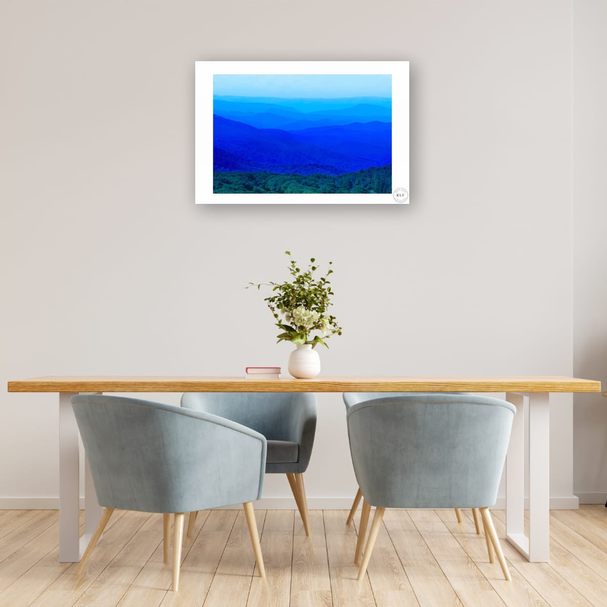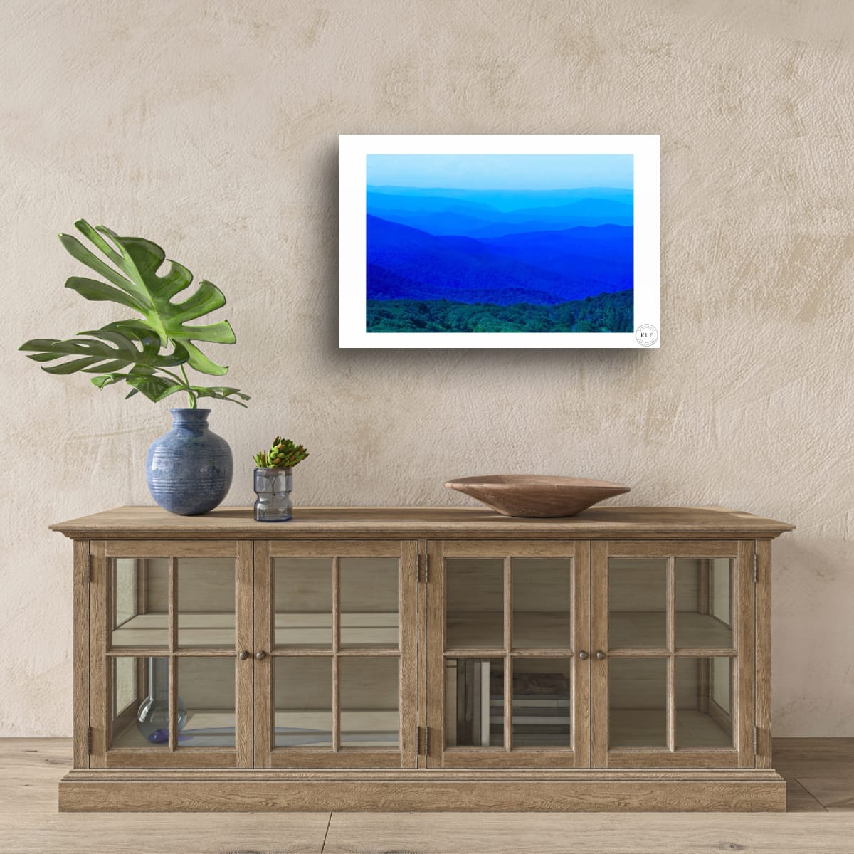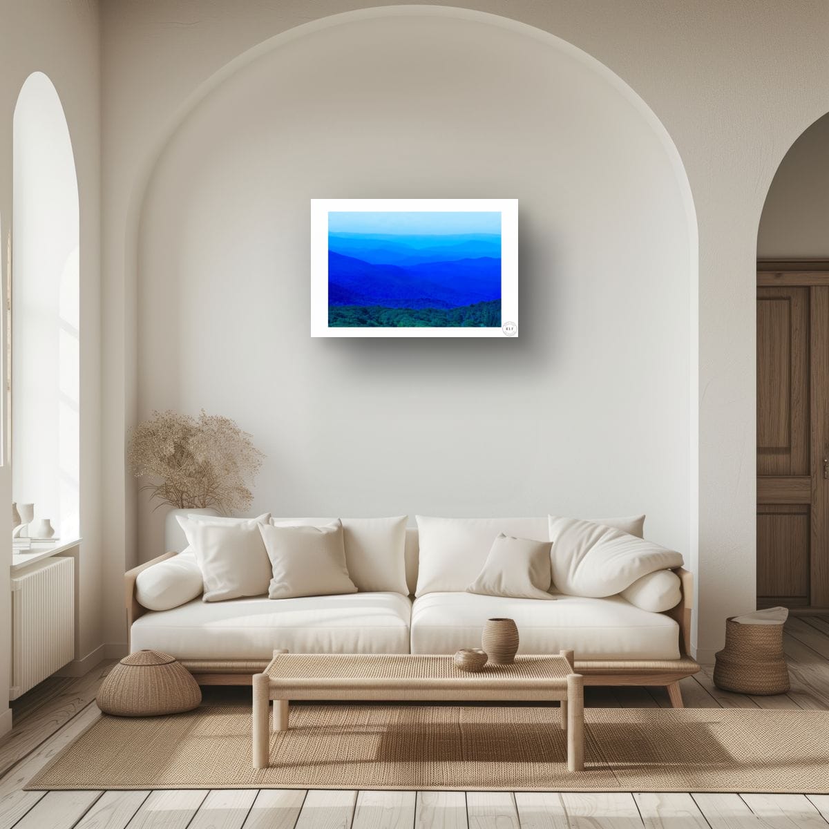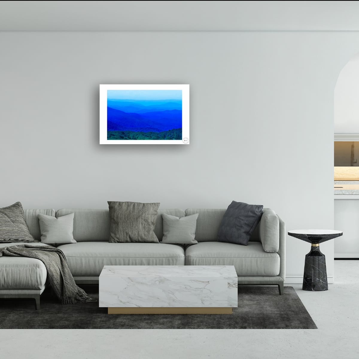 Experience the tranquil beauty of the Blue Ridge Mountains in this stunning artwork. The piece presents a layered vista of rolling hills, enveloped in serene shades of blue that evoke a sense of calm and depth. Each gradient captures the essence of the Virginia landscape, inviting viewers to reflect on nature's quiet majesty.