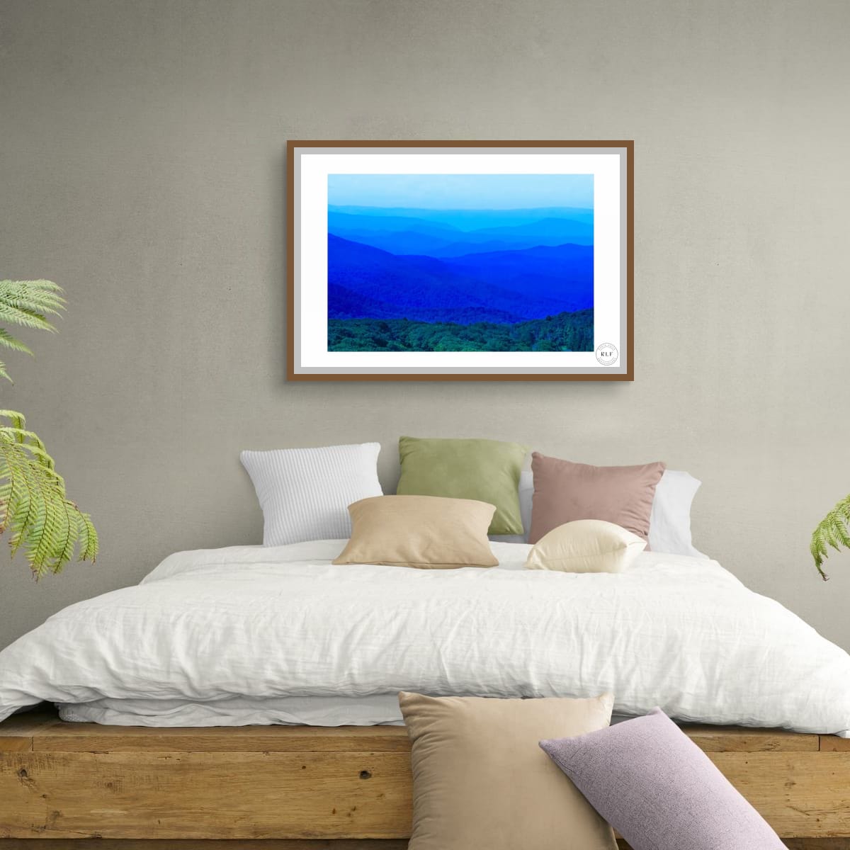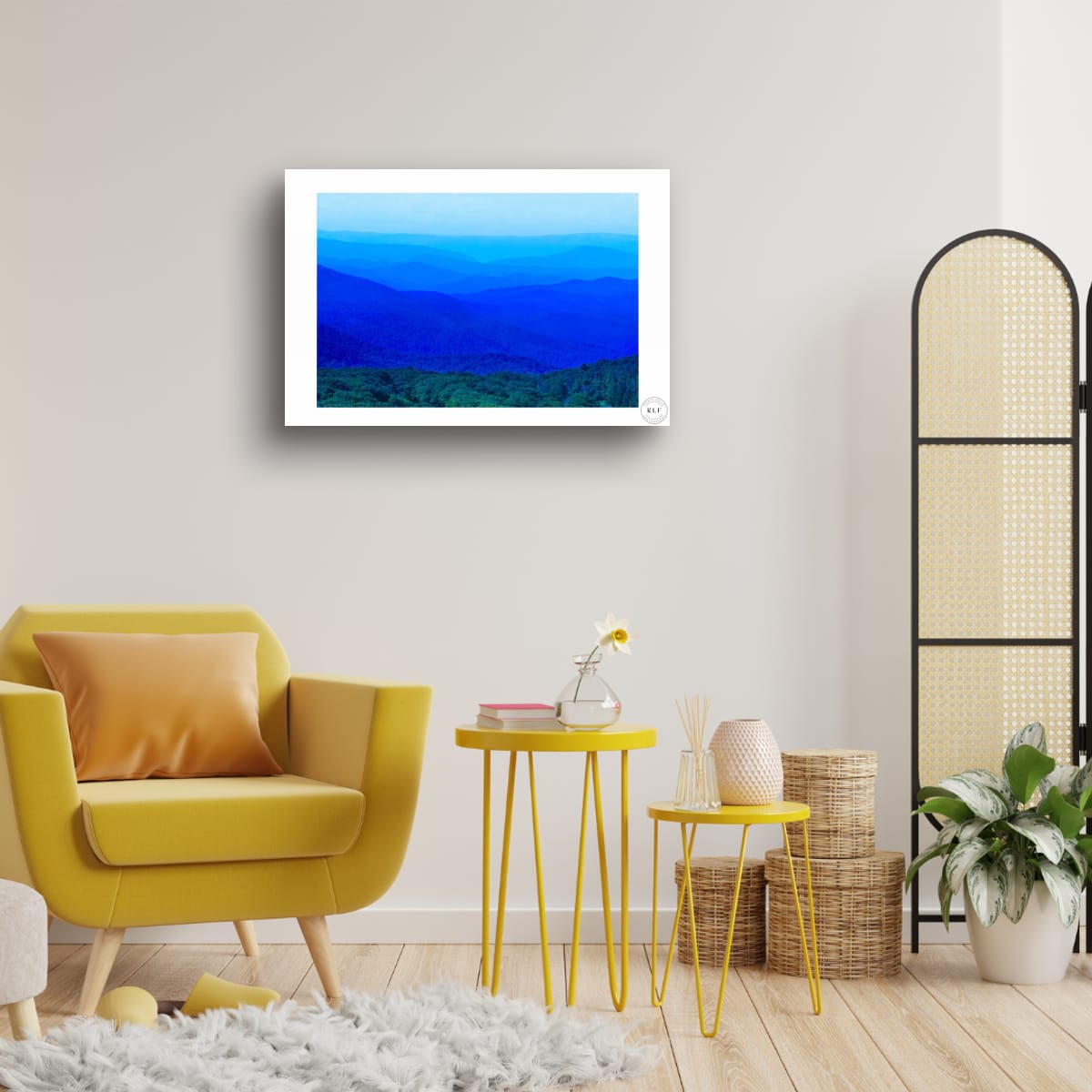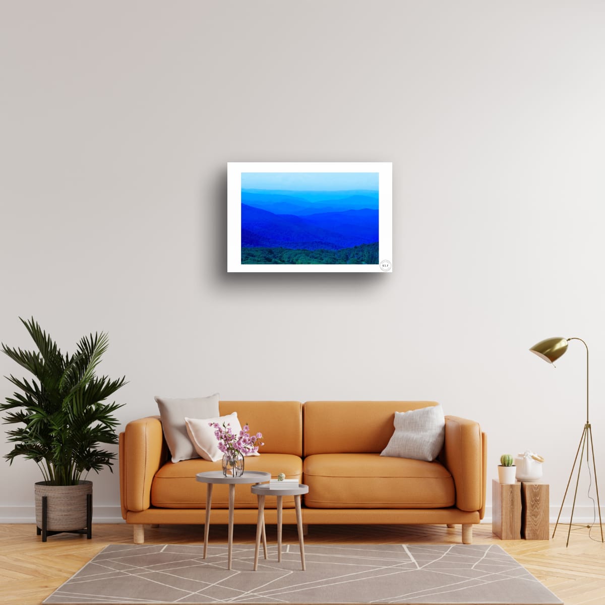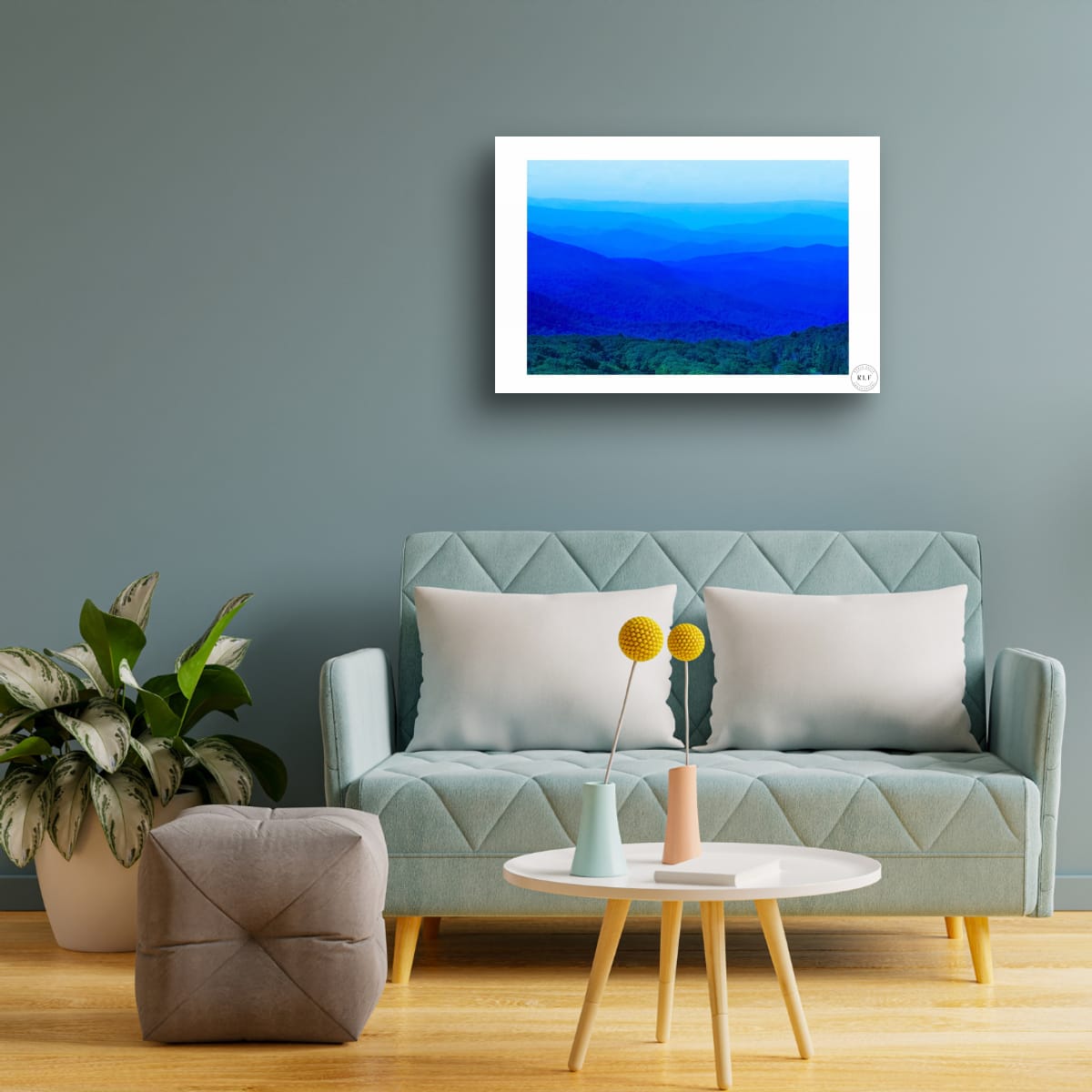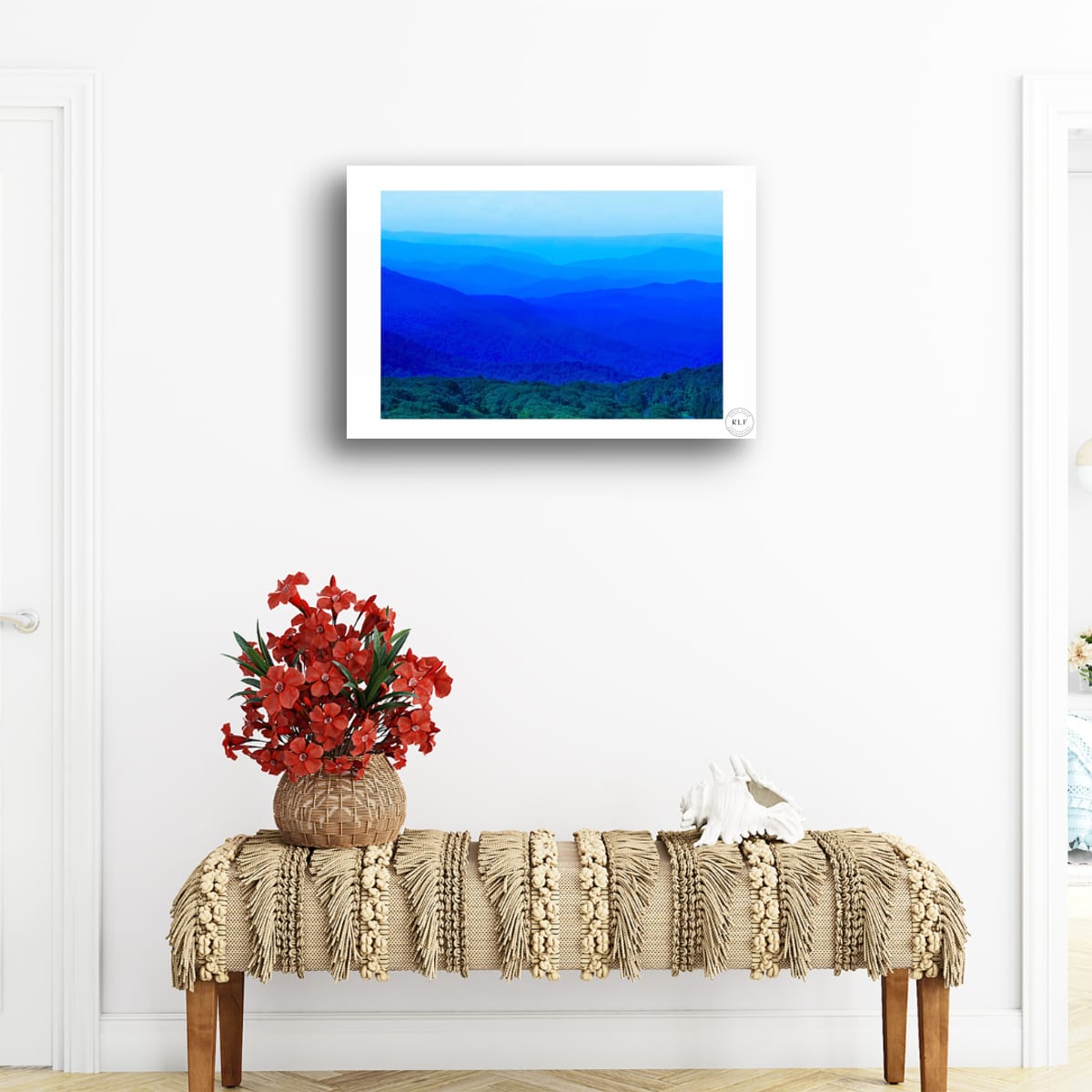 Experience the tranquil beauty of the Blue Ridge Mountains in this stunning artwork. The piece presents a layered vista of rolling hills, enveloped in serene shades of blue that evoke a sense of calm and depth. Each gradient captures the essence of the Virginia landscape, inviting viewers to reflect on nature's quiet majesty.
