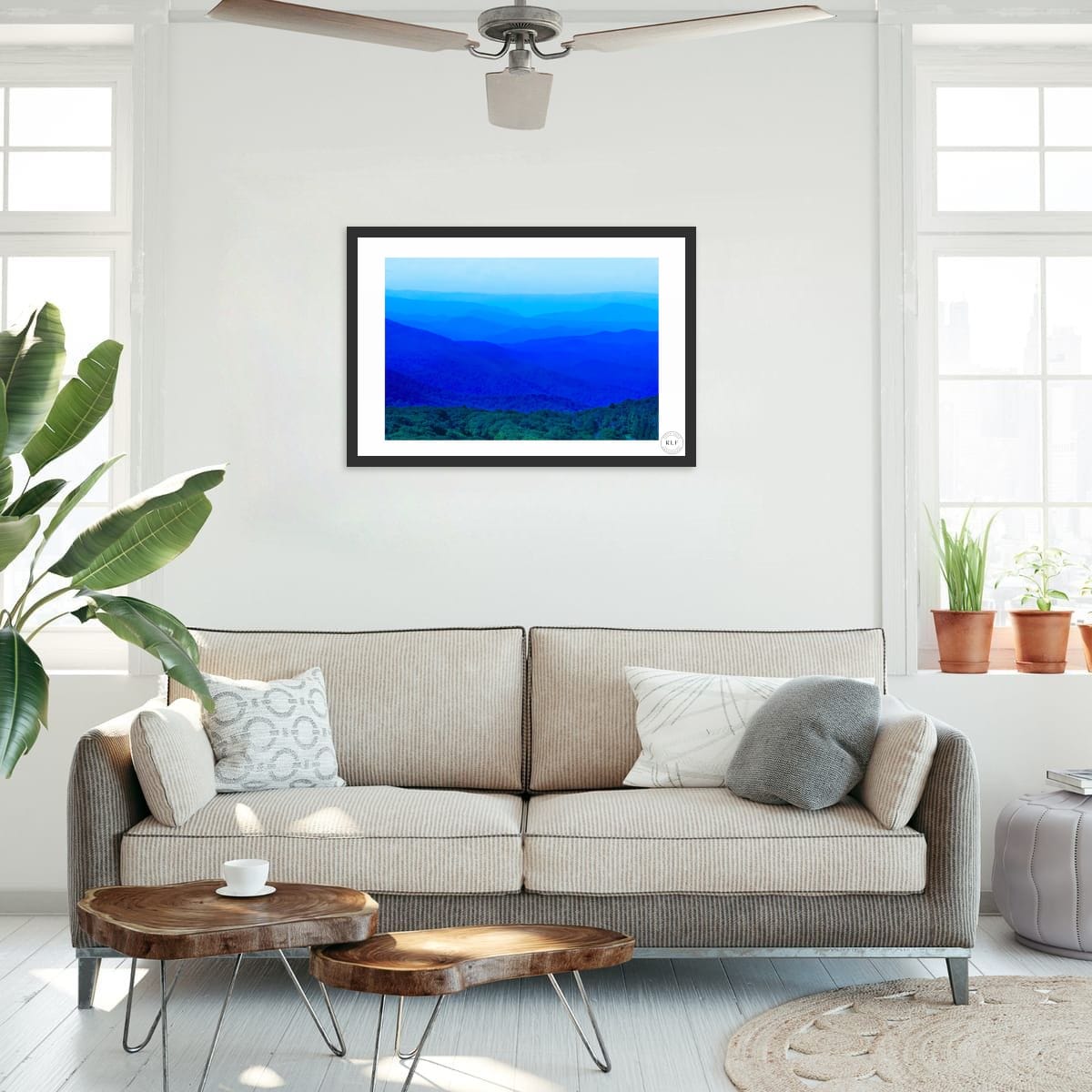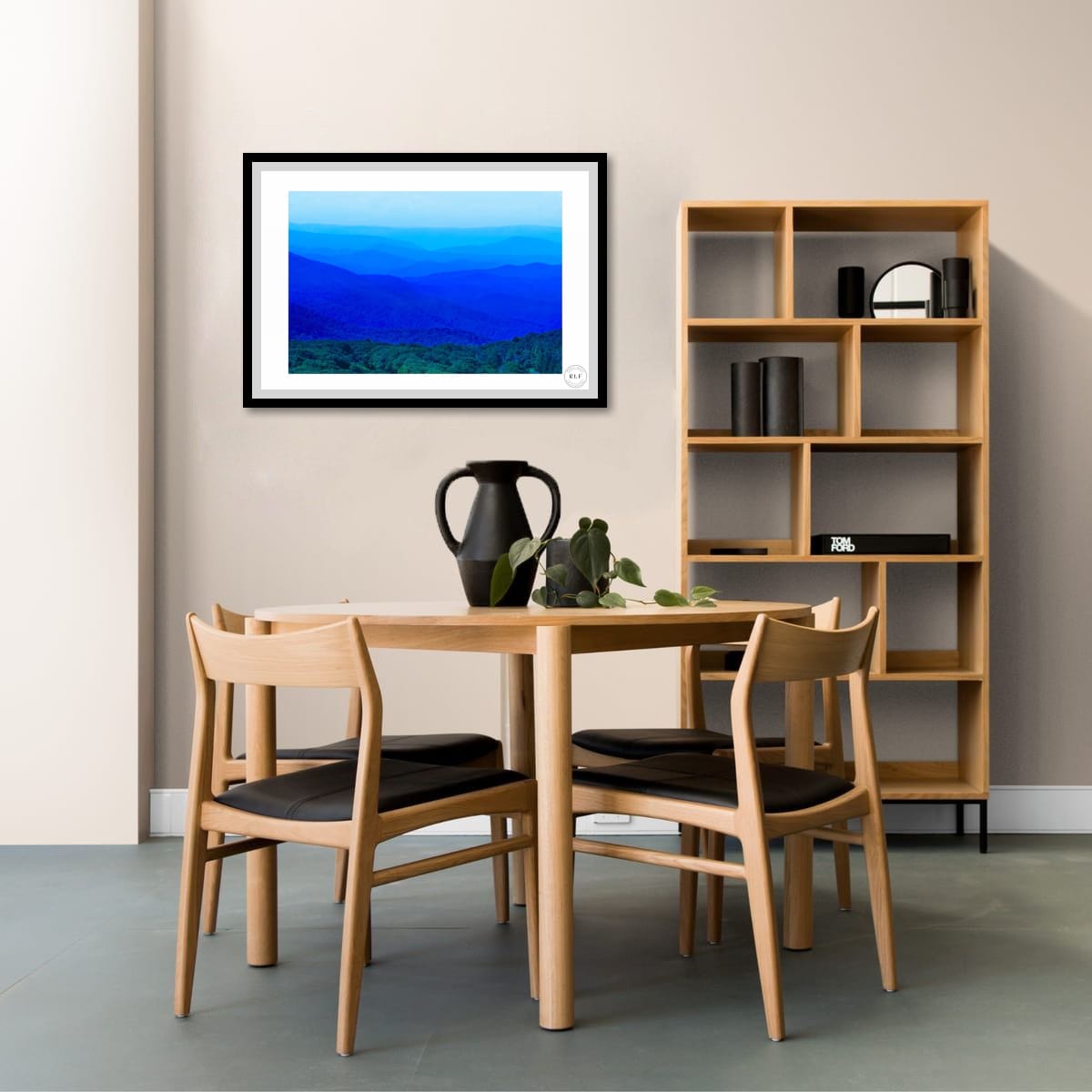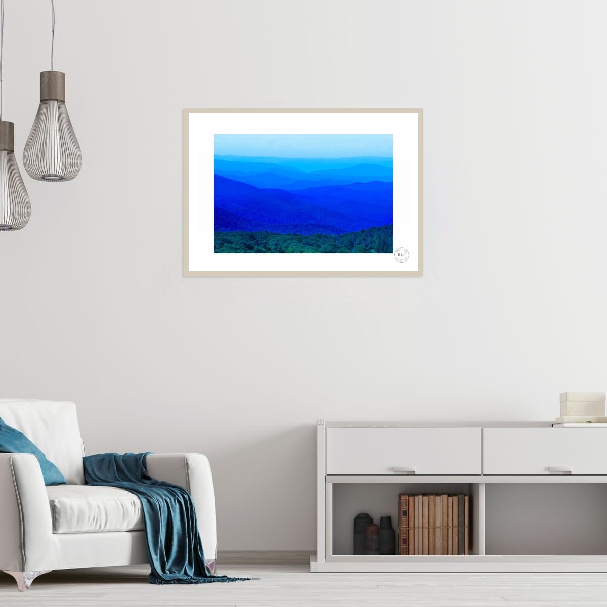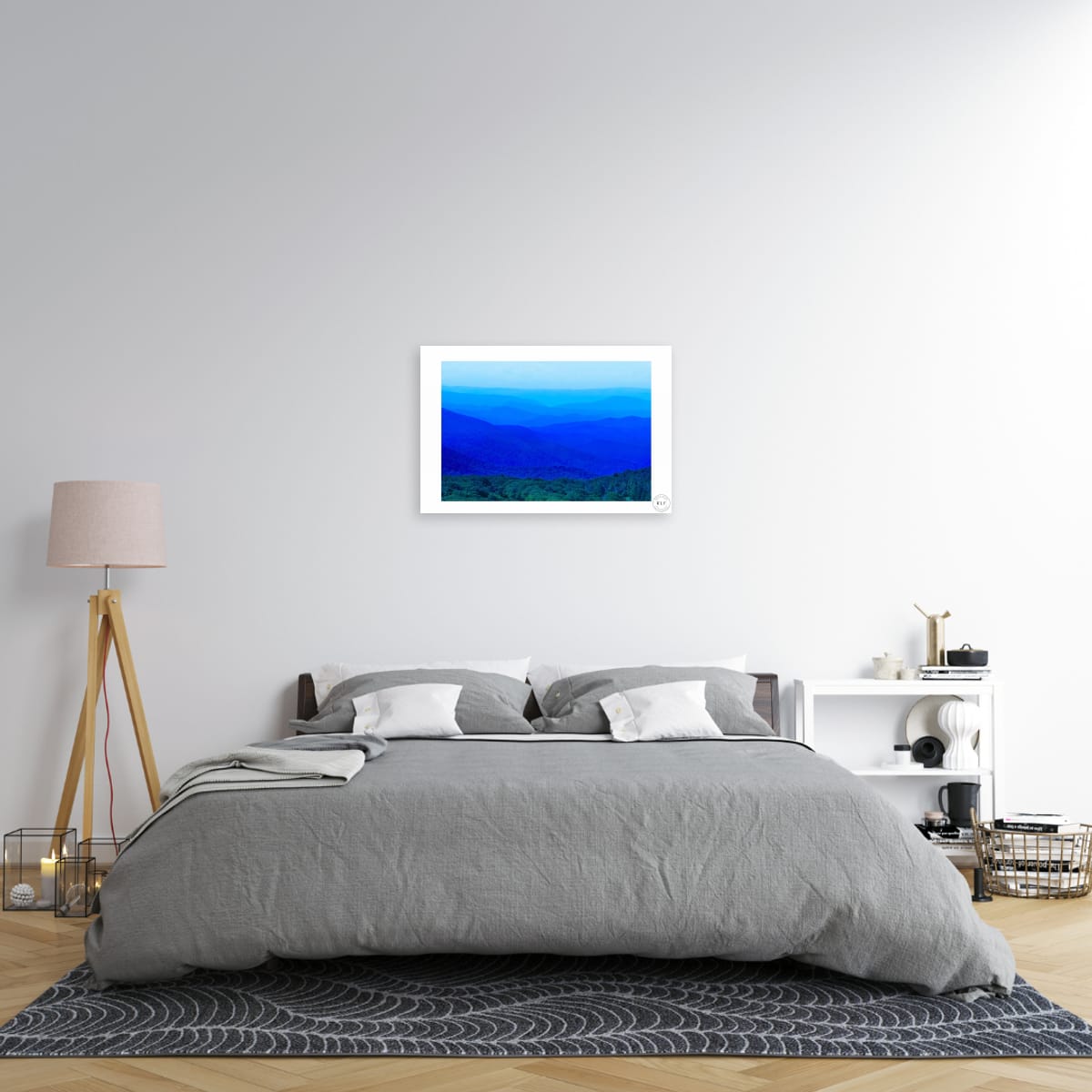 Experience the tranquil beauty of the Blue Ridge Mountains in this stunning artwork. The piece presents a layered vista of rolling hills, enveloped in serene shades of blue that evoke a sense of calm and depth. Each gradient captures the essence of the Virginia landscape, inviting viewers to reflect on nature's quiet majesty.