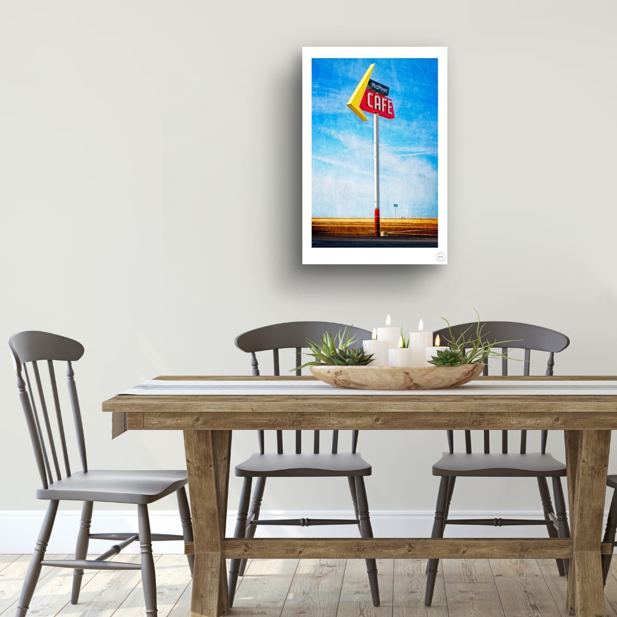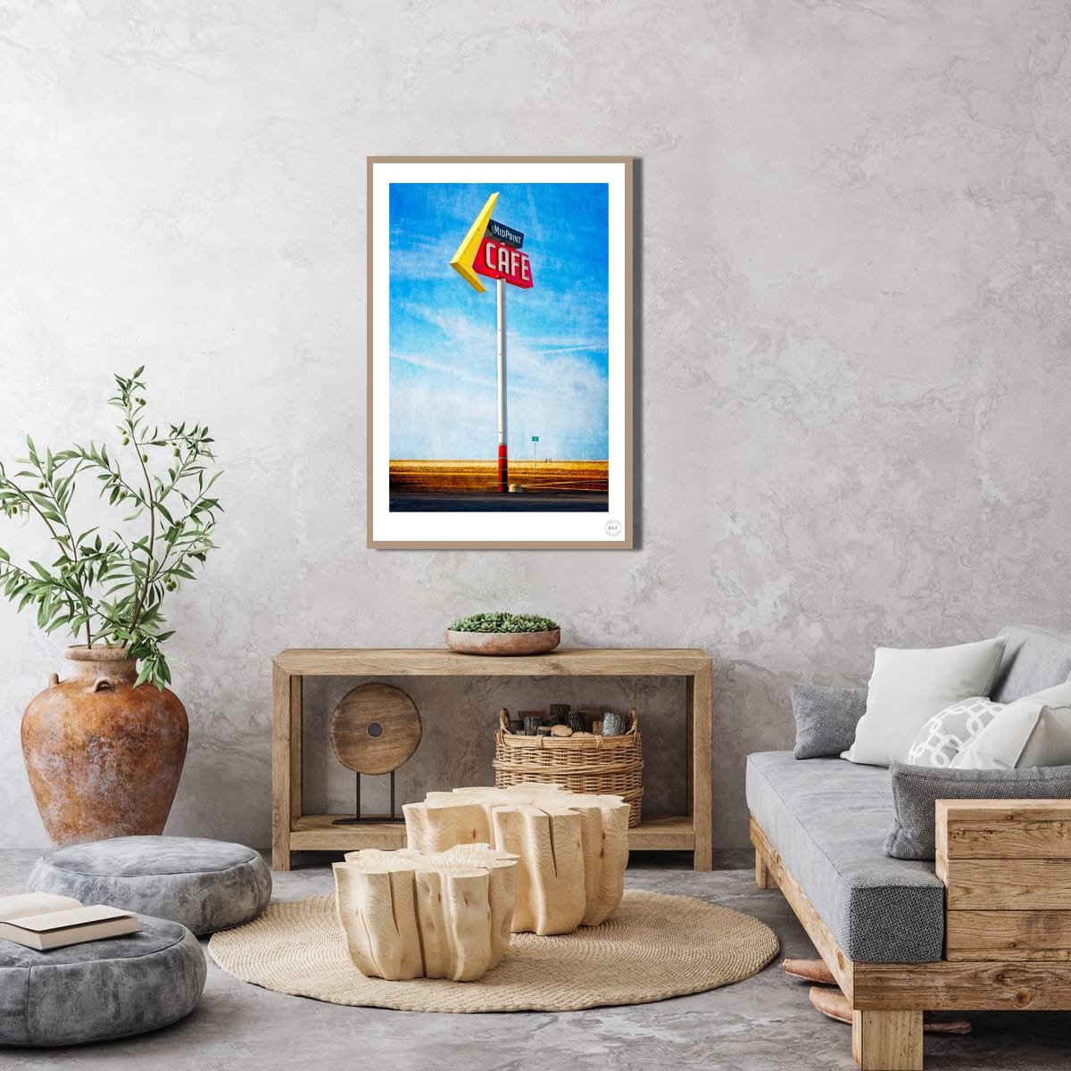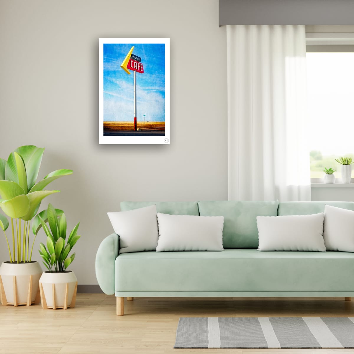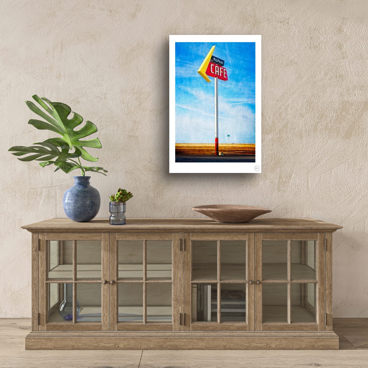 This artwork captures the vivid colours of the Southwestern sky and the distinctive mid-century modern design of the café’s sign, making it a perfect piece for anyone who loves vintage Americana. The image evokes the romance of long drives, neon lights, and the classic culture of diners and motels that once lined Route 66.