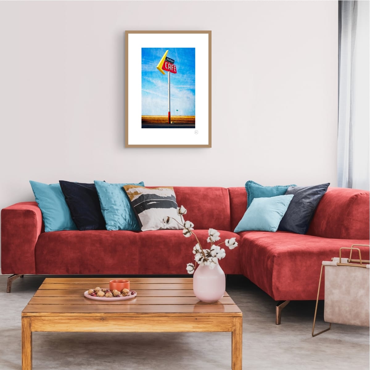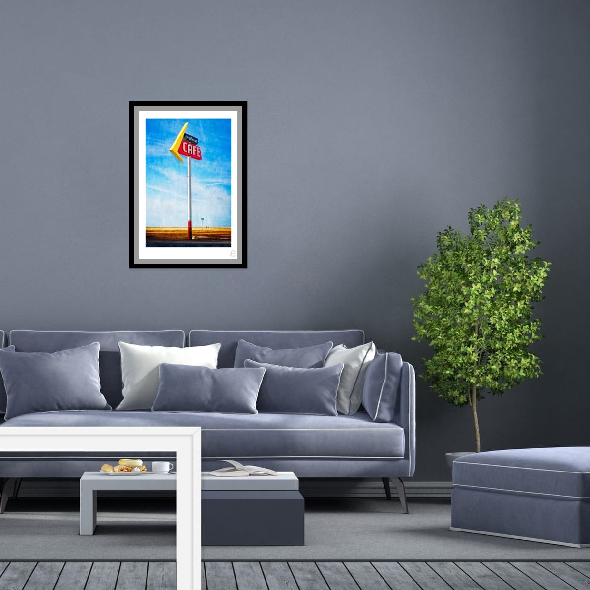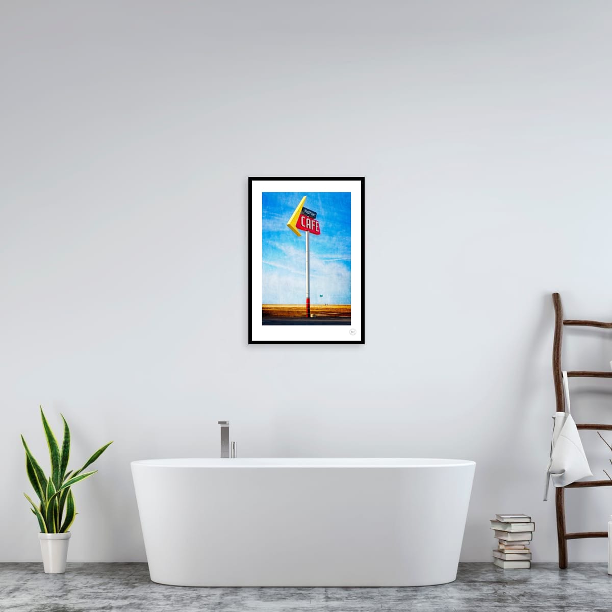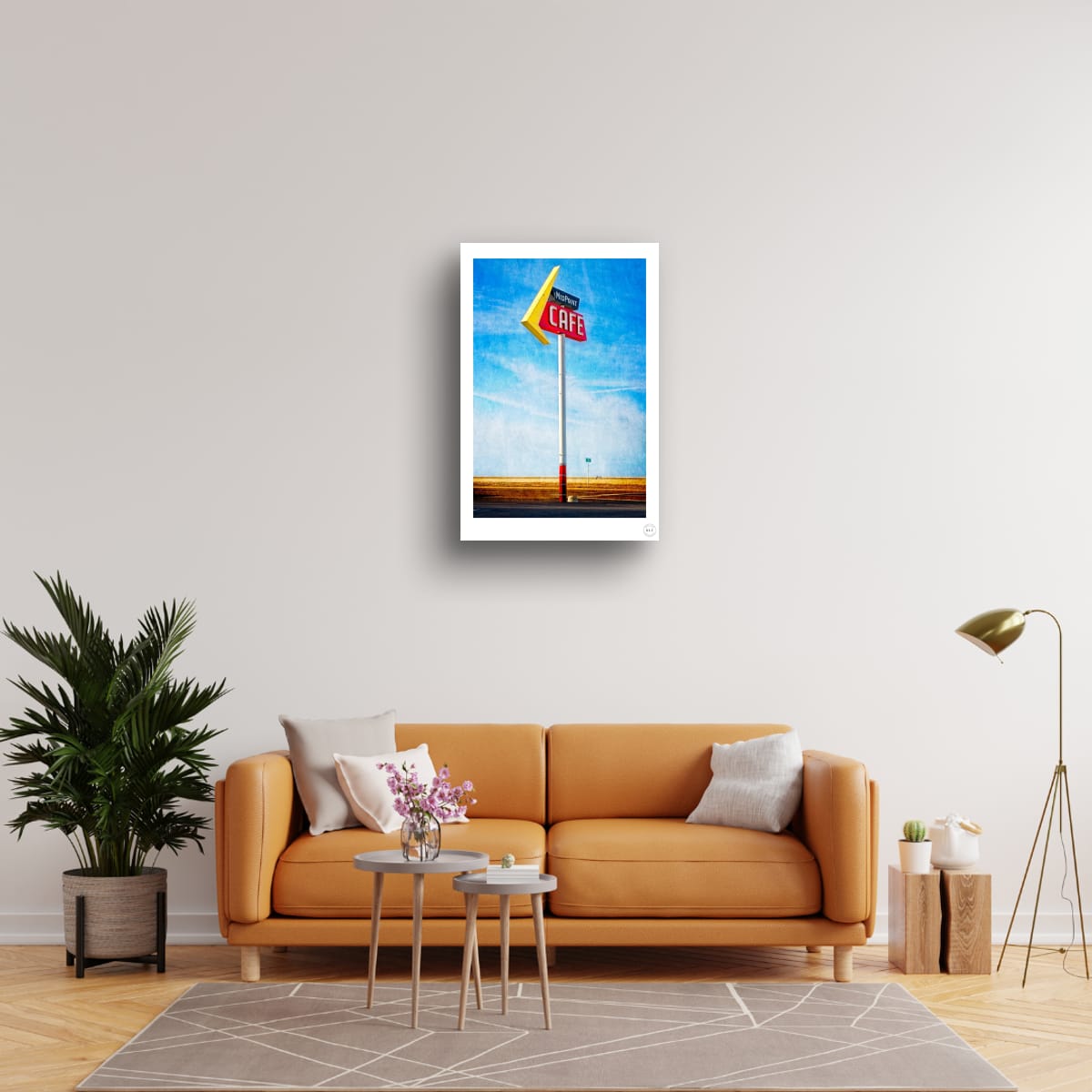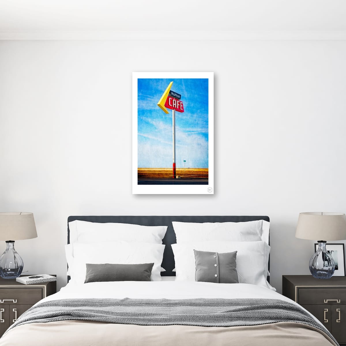 This artwork captures the vivid colours of the Southwestern sky and the distinctive mid-century modern design of the café’s sign, making it a perfect piece for anyone who loves vintage Americana. The image evokes the romance of long drives, neon lights, and the classic culture of diners and motels that once lined Route 66.