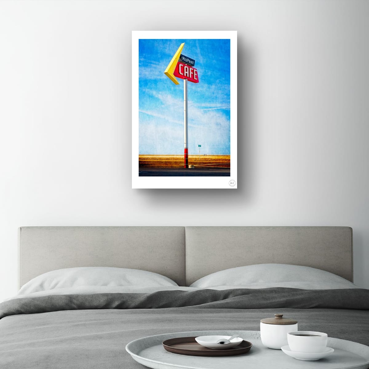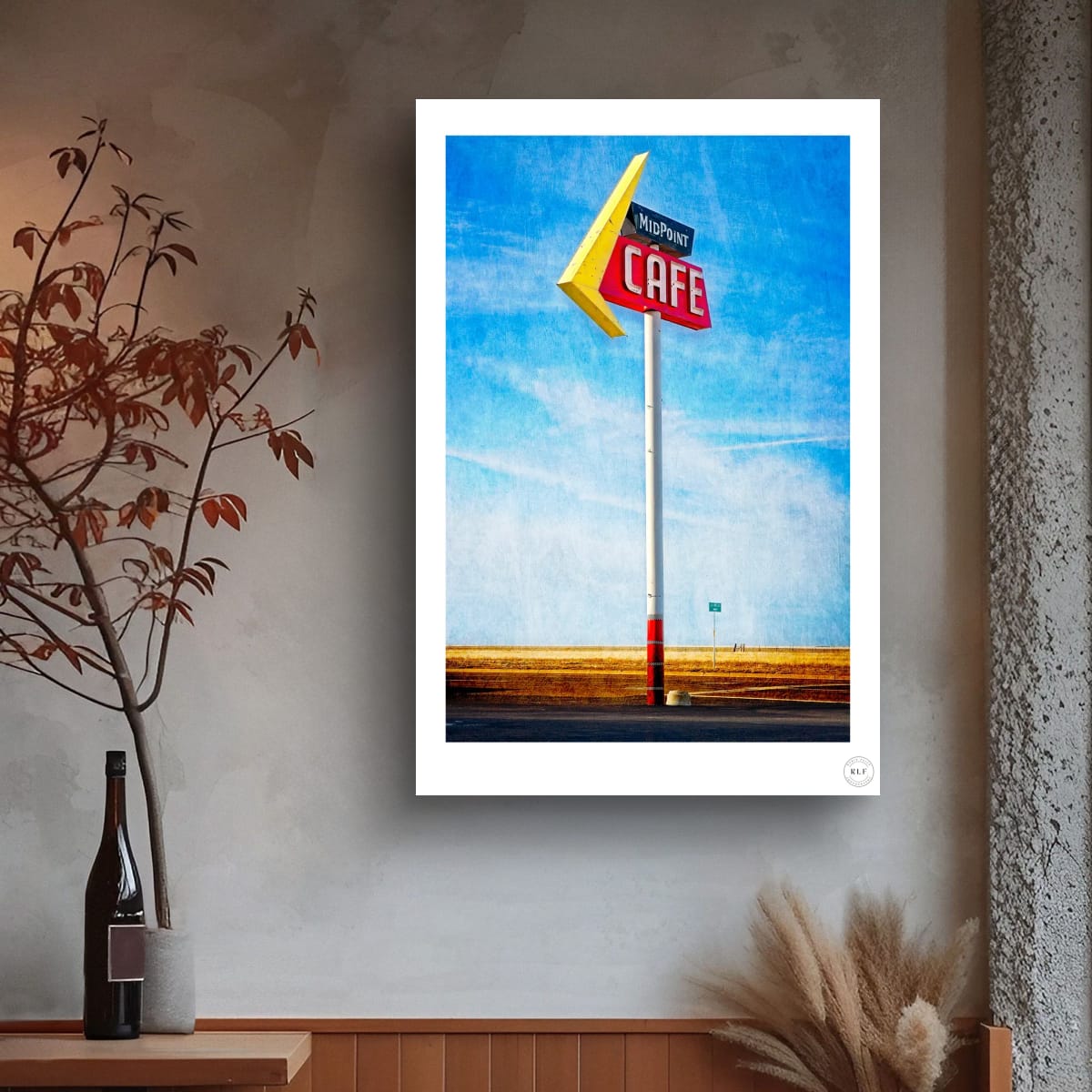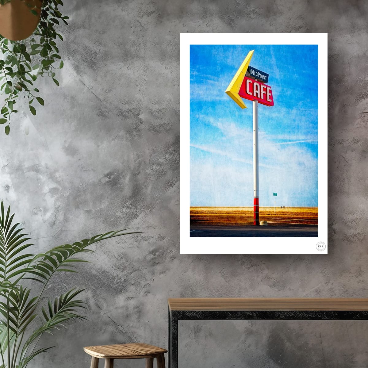 Celebrate the golden age of the American road trip with this striking wall art print of the MidPoint Café sign, one of the most iconic landmarks along historic Route 66. Situated exactly halfway between Chicago and Los Angeles, MidPoint Café has been a nostalgic stop for travellers since the 1920s. Known for its classic diner charm and timeless roadside atmosphere, the café and its bold retro sign symbolize freedom, adventure, and the open road.