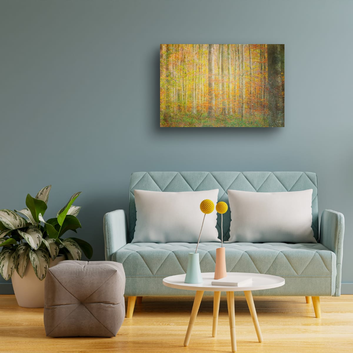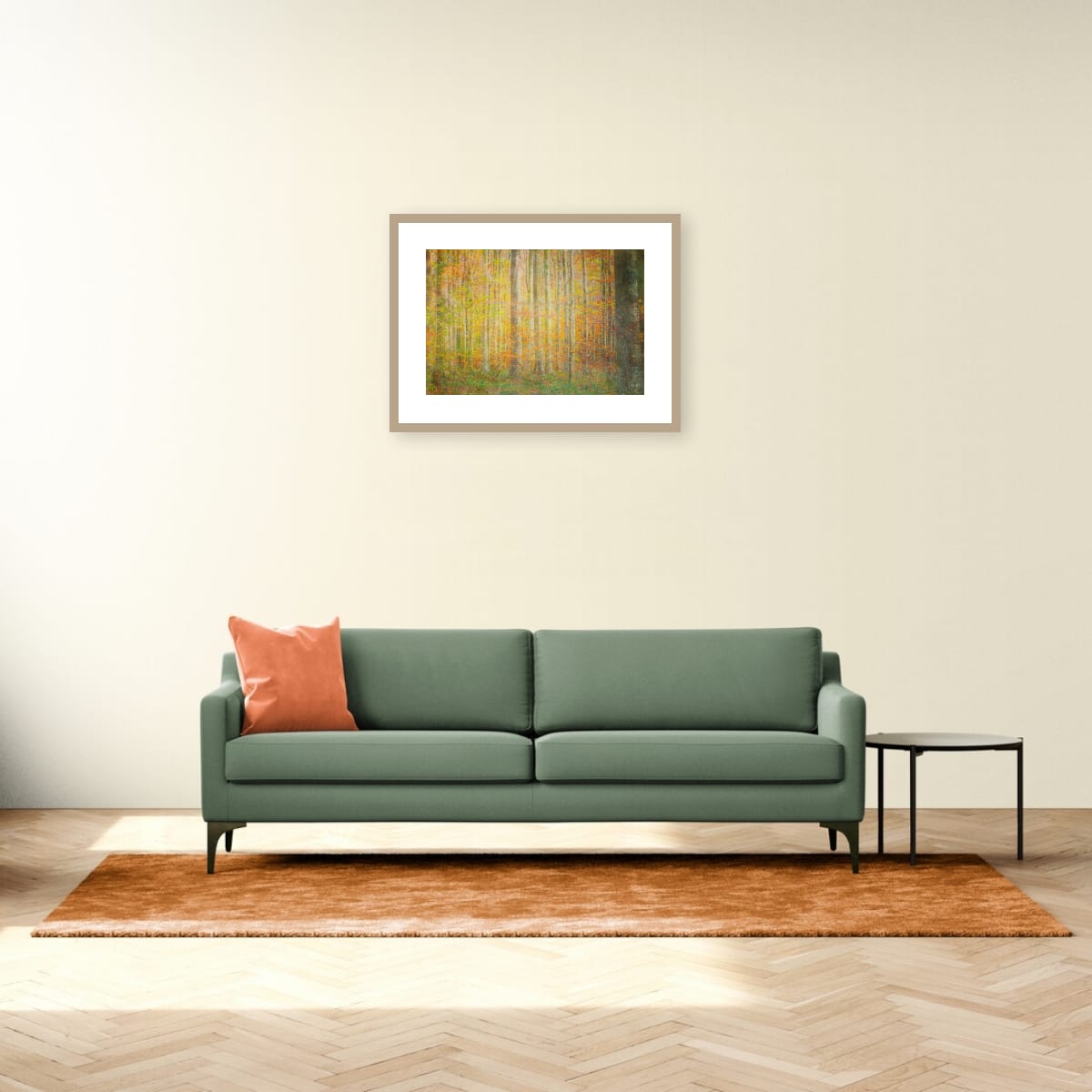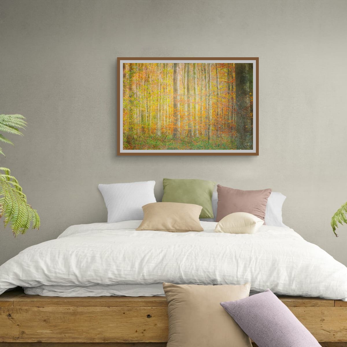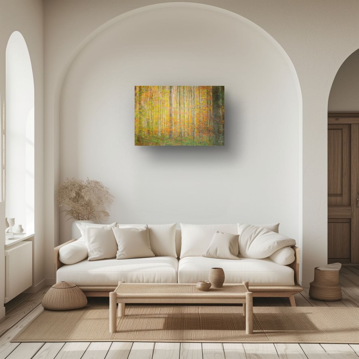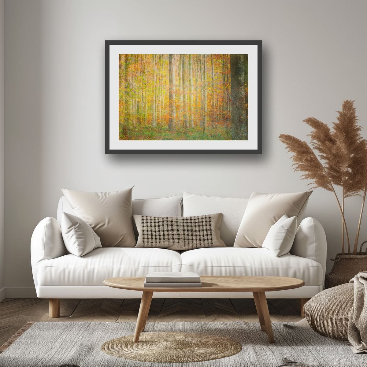 This picture presents a tranquil scene of a Sussex woodland, where the rich hues of autumn foliage create a harmonious blend of colour and texture. The trees stand straight, their trunks revealing the passage of time, while the leaves transition from vibrant greens to warm oranges and golds and there are traces of green foliage on the ground. This piece conveys a sense of calm, inviting the viewer to reflect on the beauty of nature's cycles.