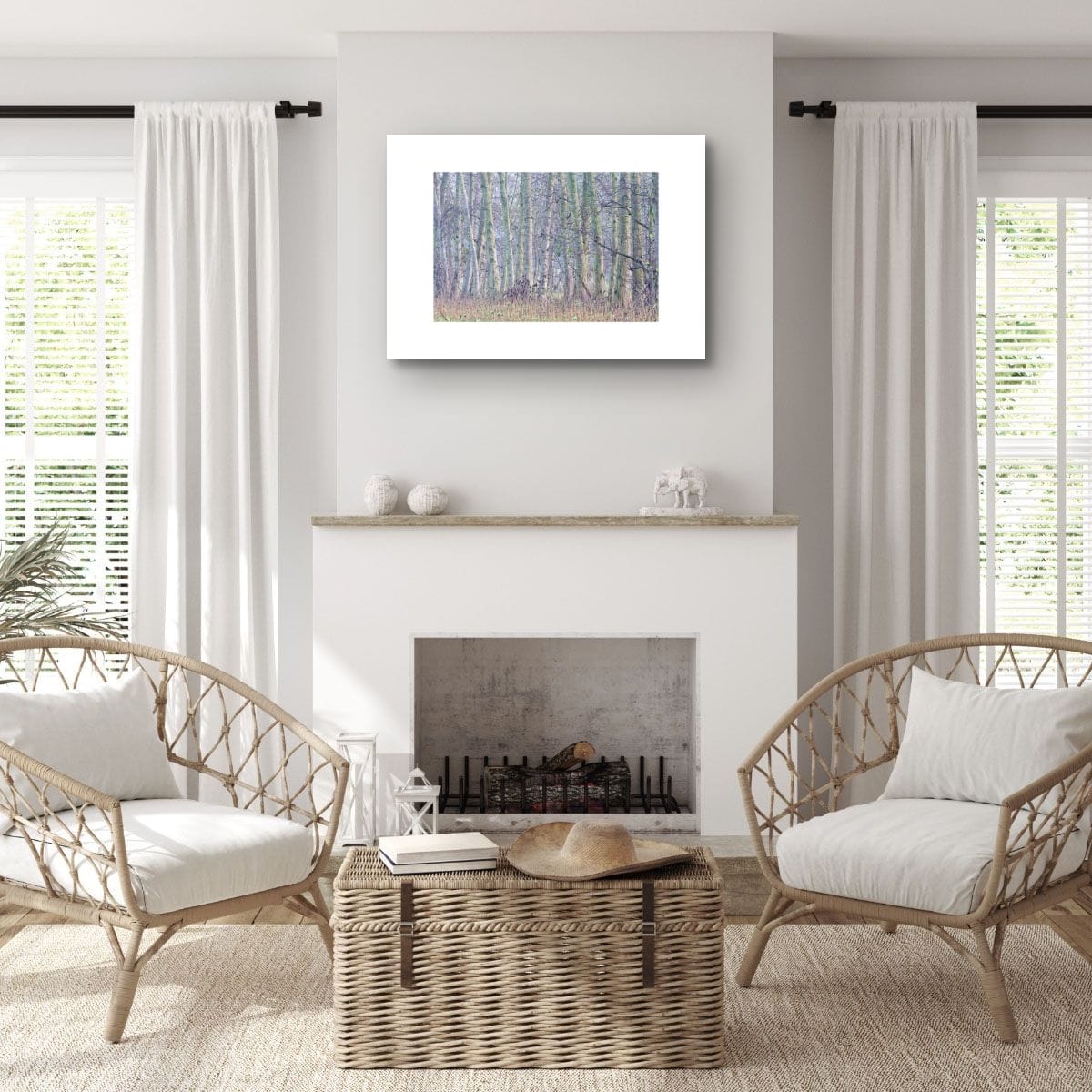 The trees stand in quiet harmony, and subtle hints of greenery peek through the muted tones, while the low contrast image reveals the intricate textures of the bark and the delicate branches, creating a tranquil atmosphere. inviting a sense of calm and reflection.